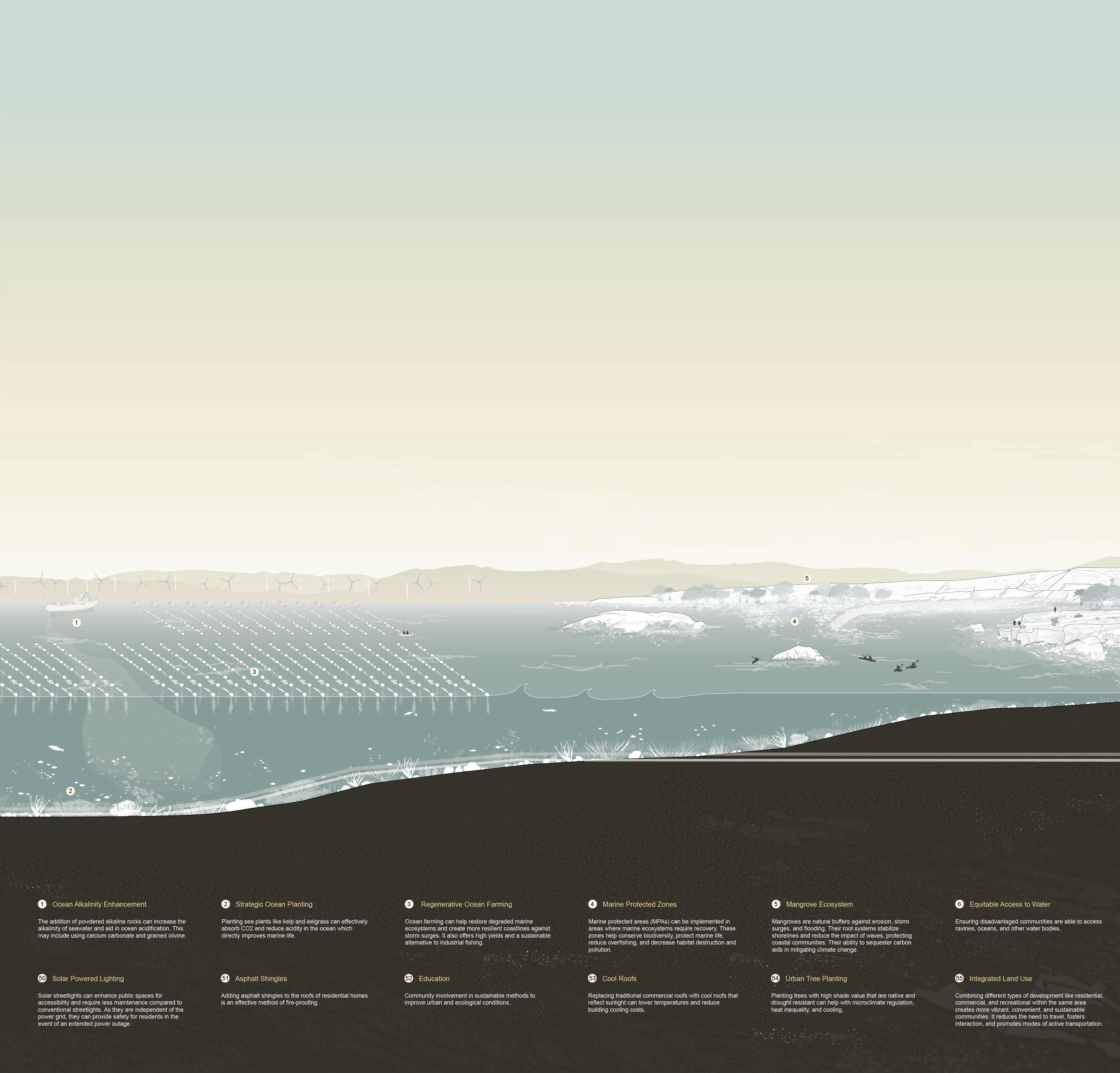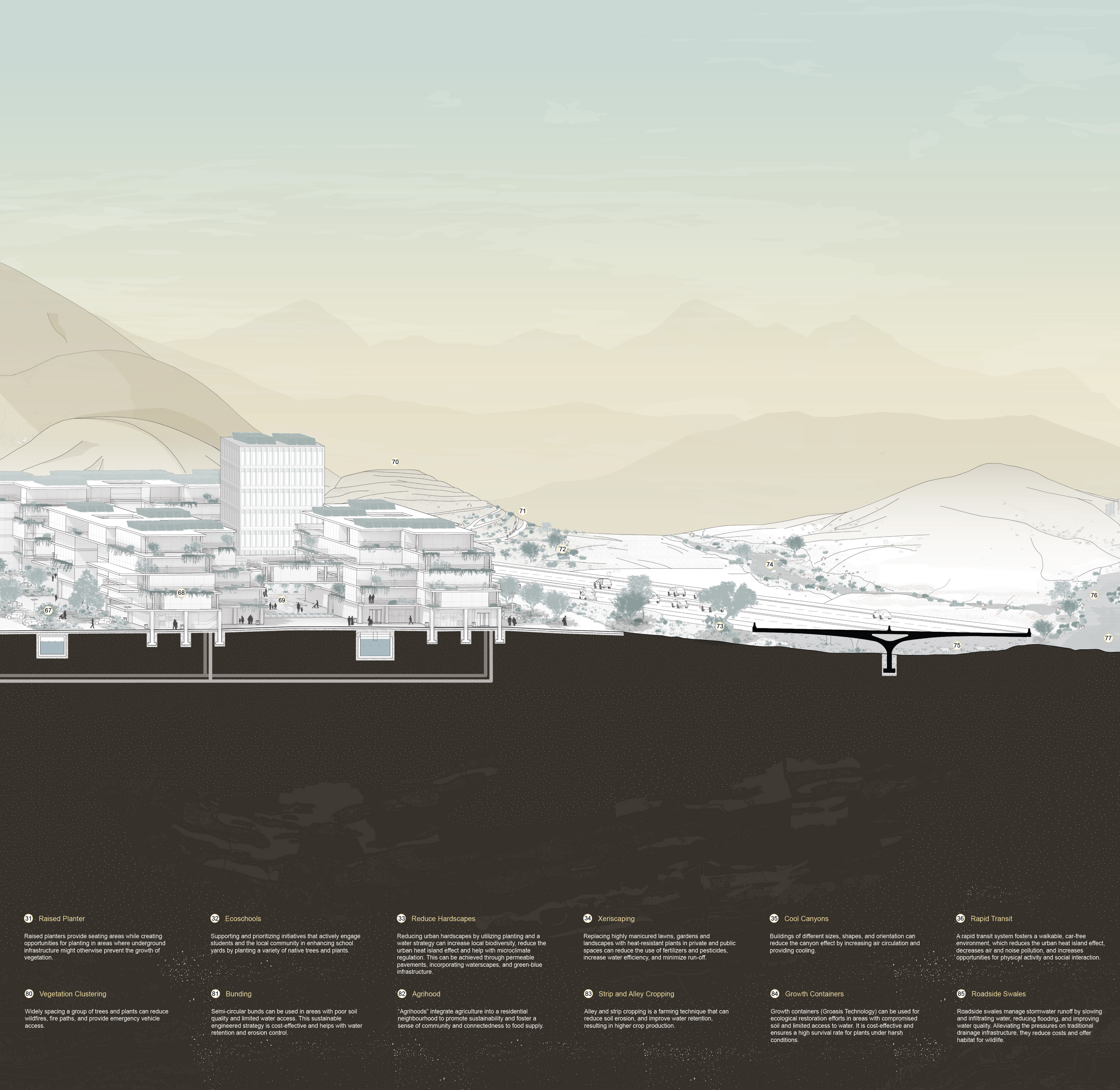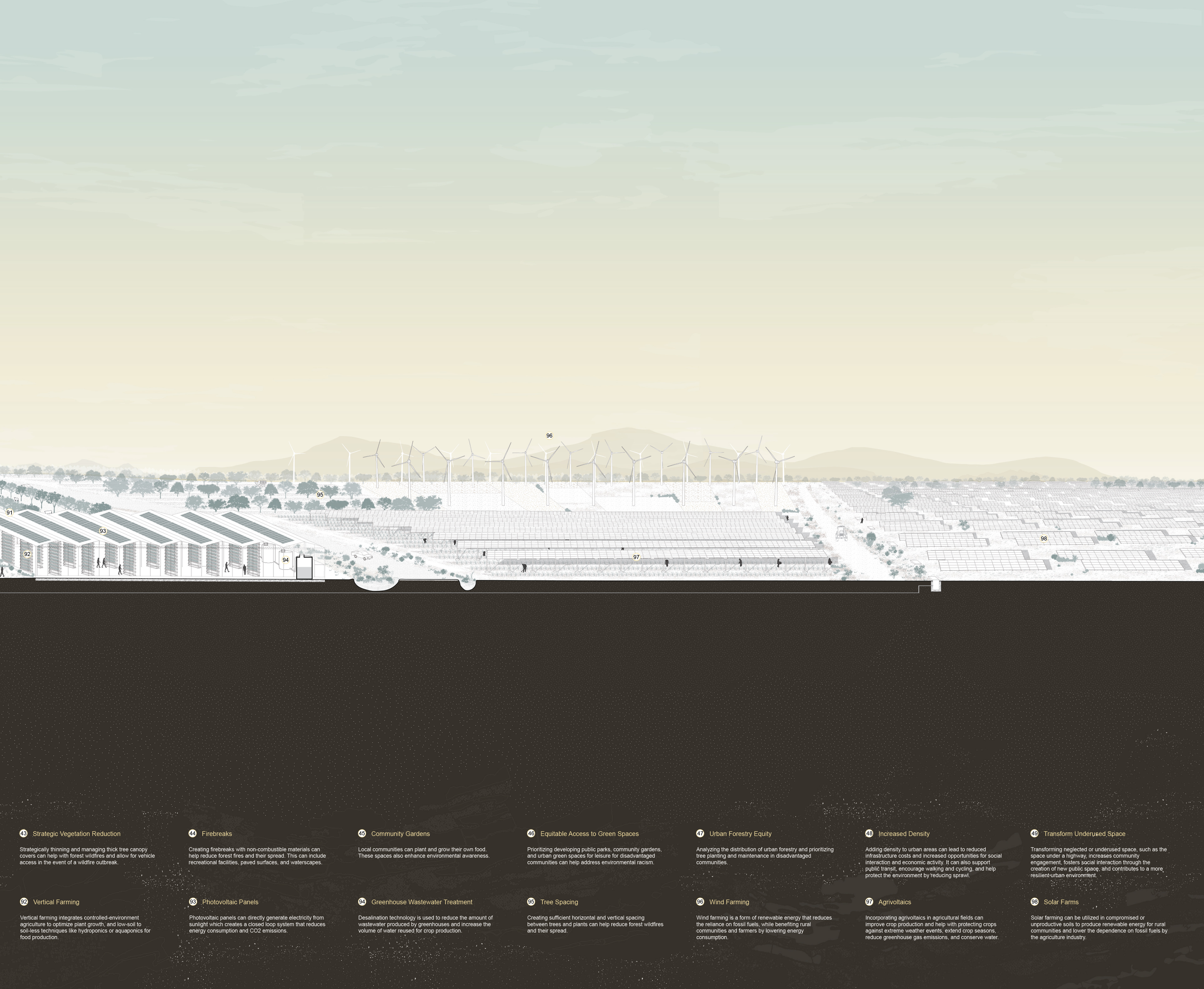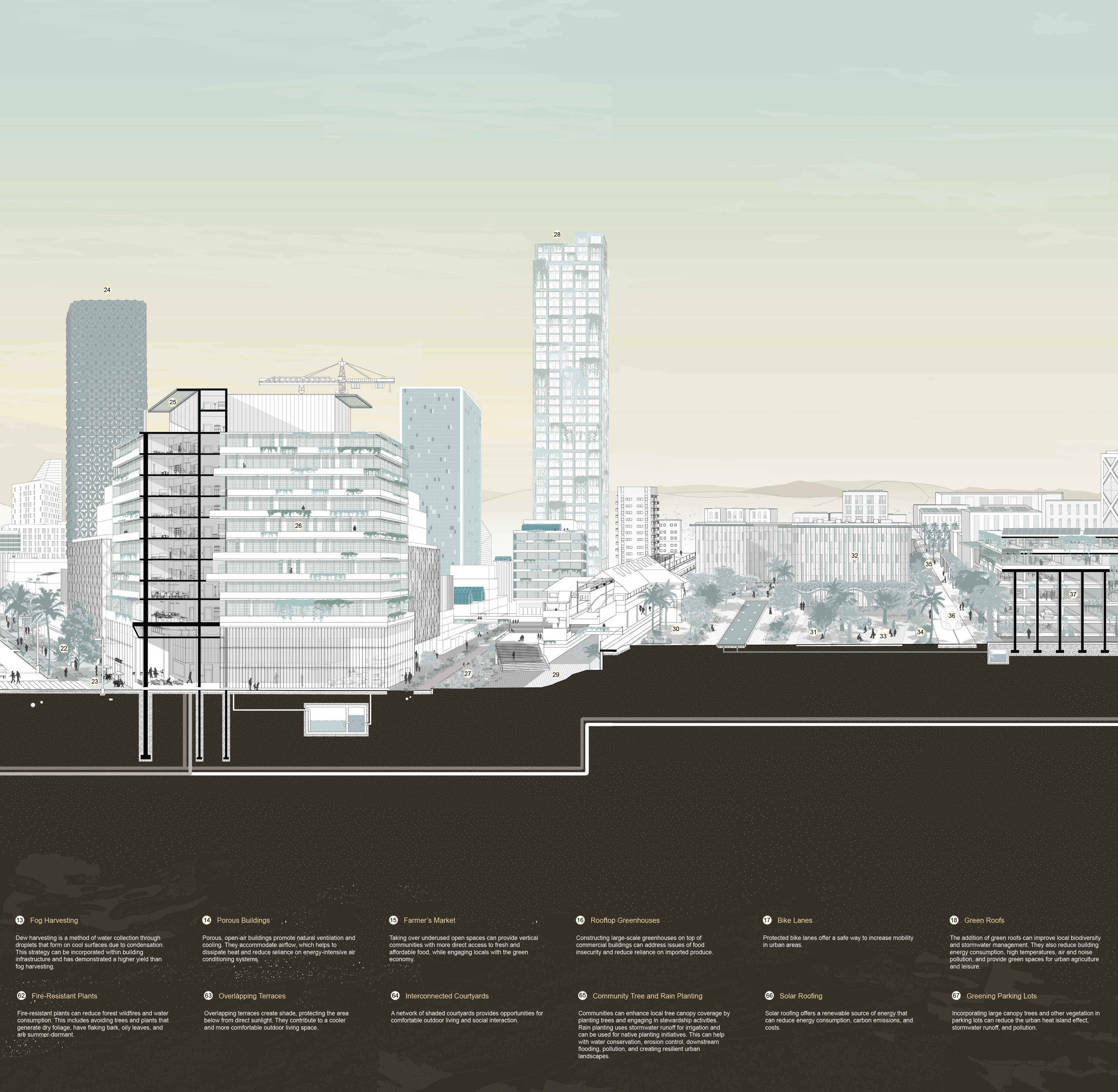 Ways to mitigate and adapt to these harsh conditions are represented by nearly one hundred climate resilience strategies visualized and indexed along the transect. The drawing spatializes natural, social, mechanical, agricultural, urban, and hydrological adaptation strategies at different scales, from site-scale to new models of urbanism and land-use planning.