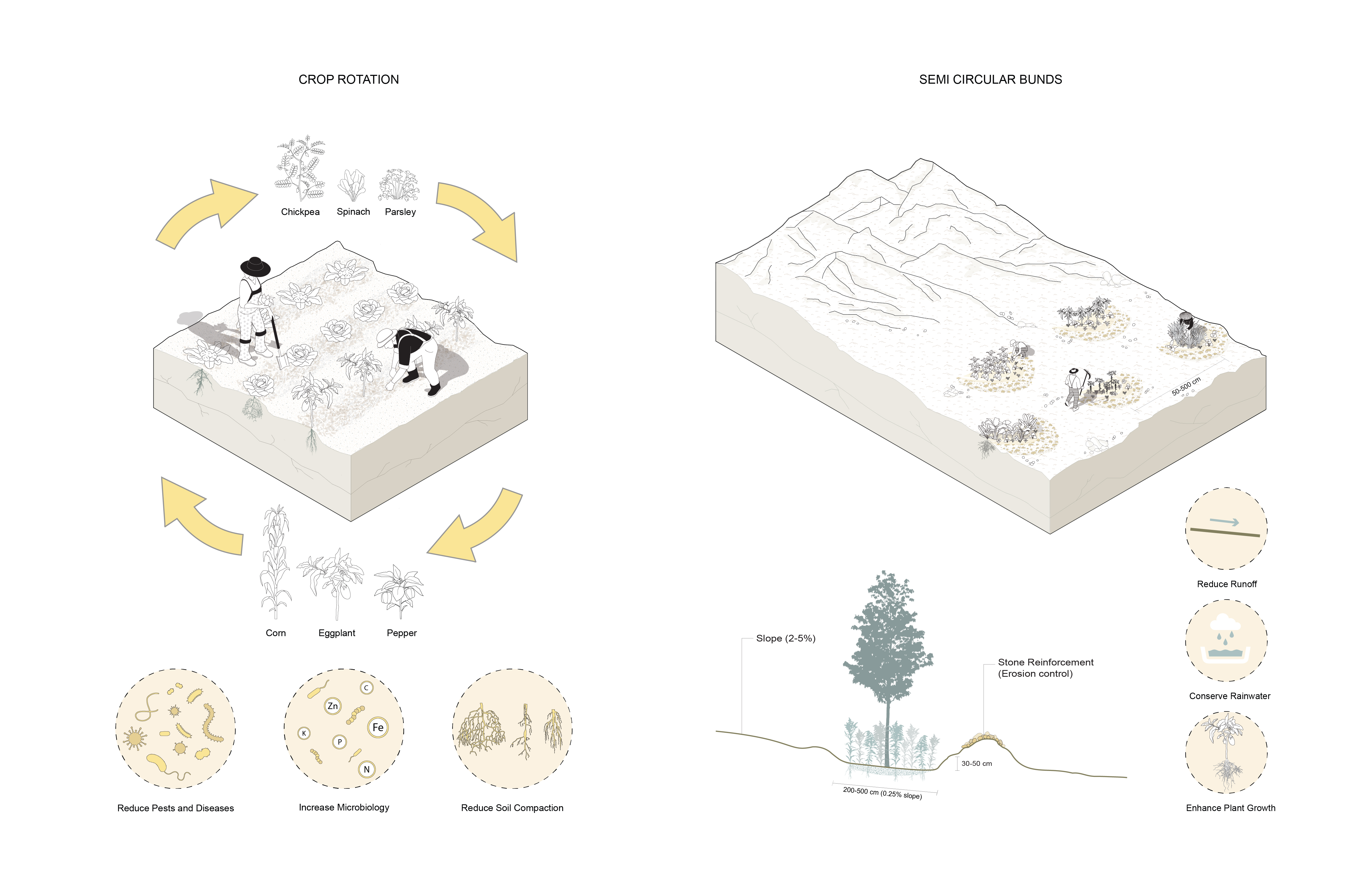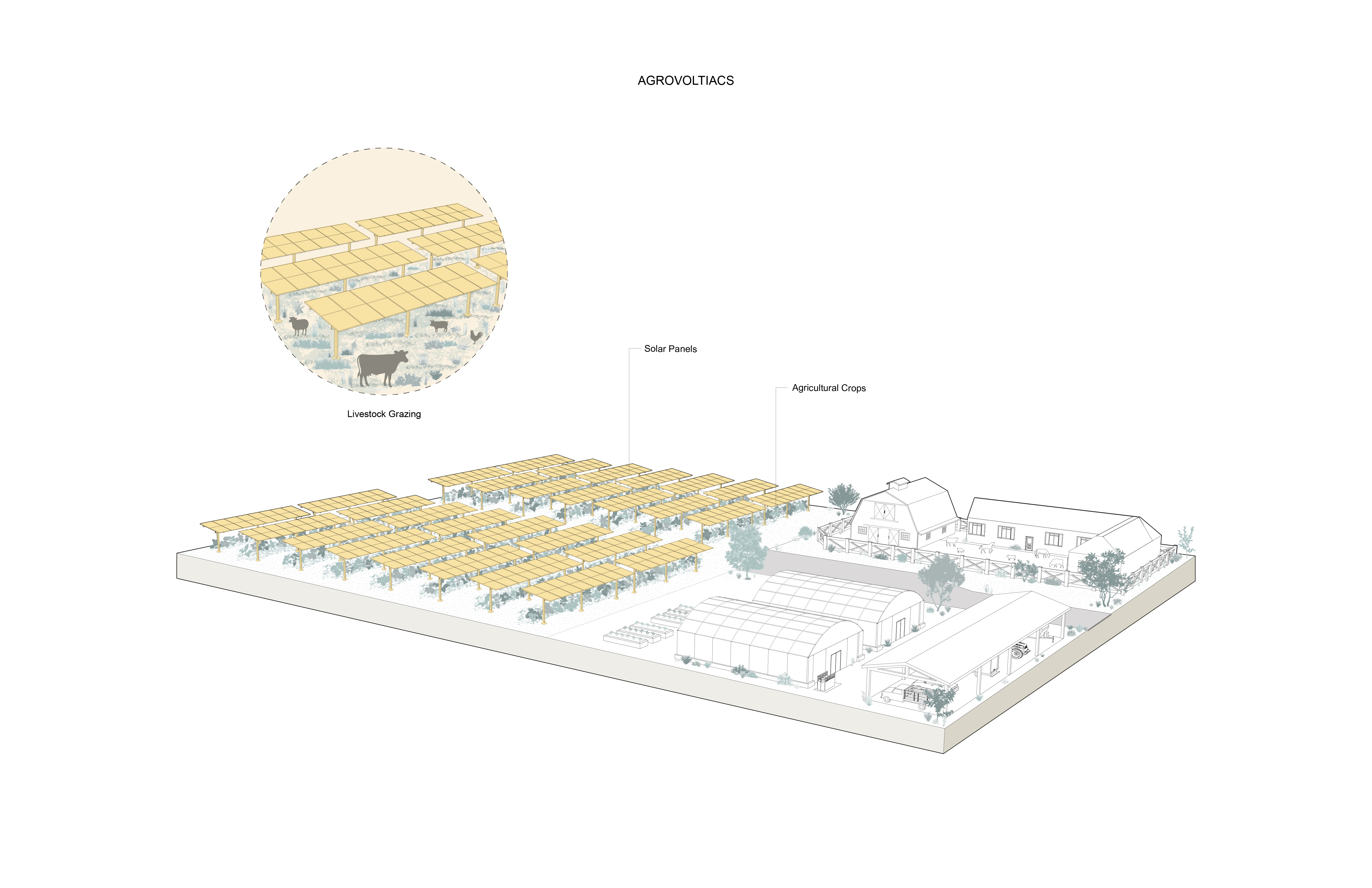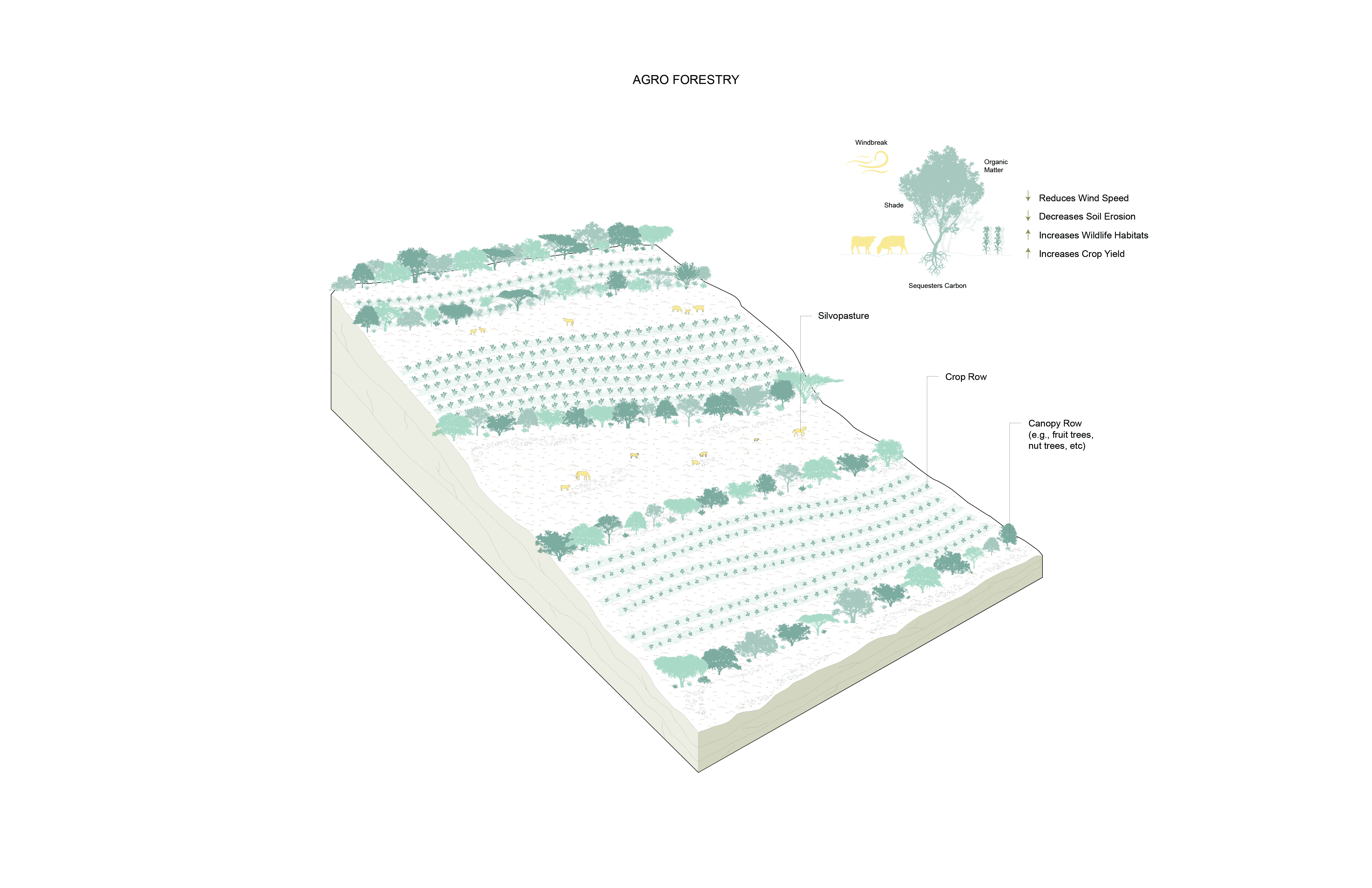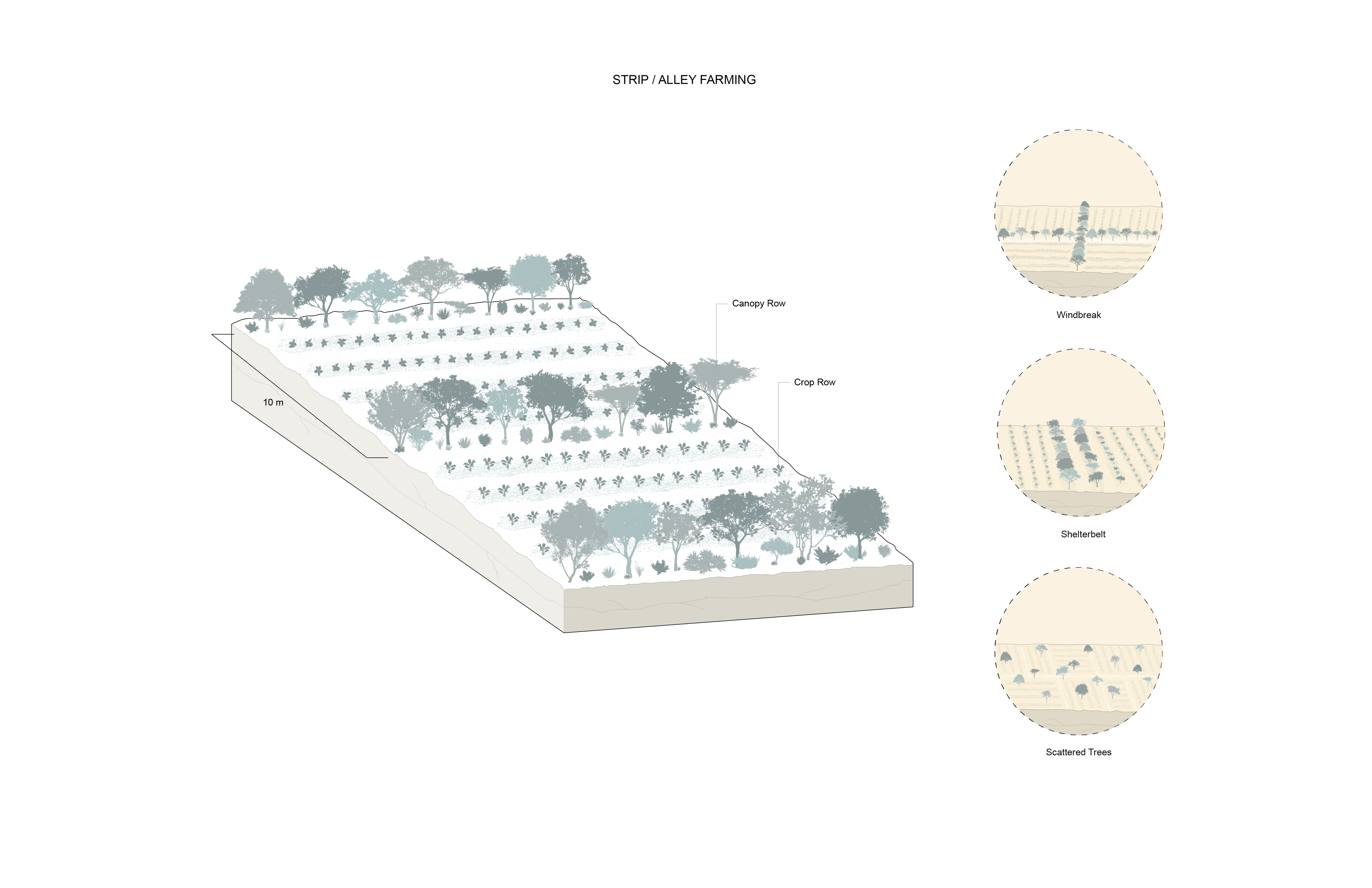 Ways to mitigate and adapt to these harsh conditions are represented by nearly one hundred climate resilience strategies visualized and indexed along the transect. The drawing spatializes natural, social, mechanical, agricultural, urban, and hydrological adaptation strategies at different scales, from site-scale to new models of urbanism and land-use planning.