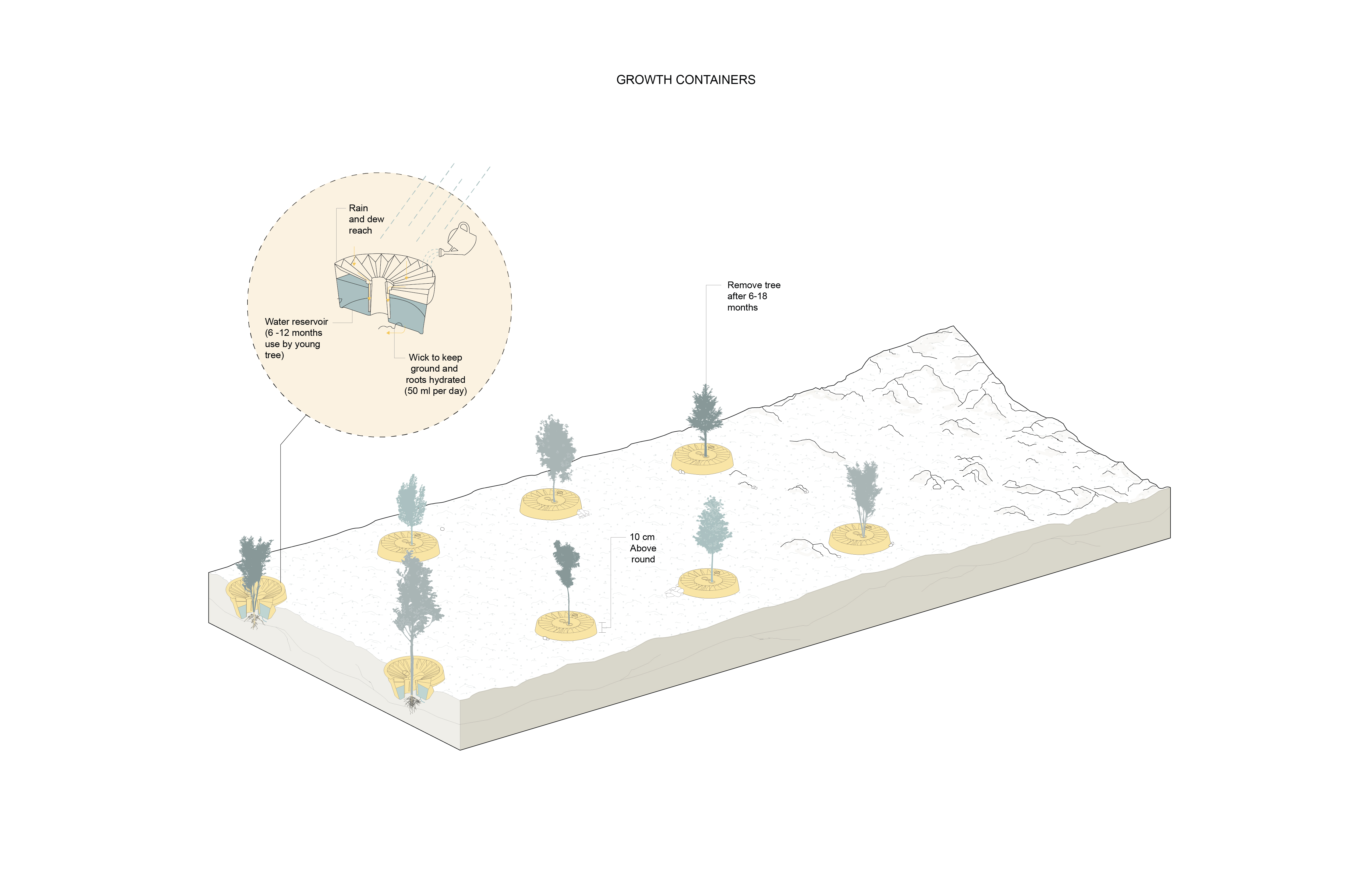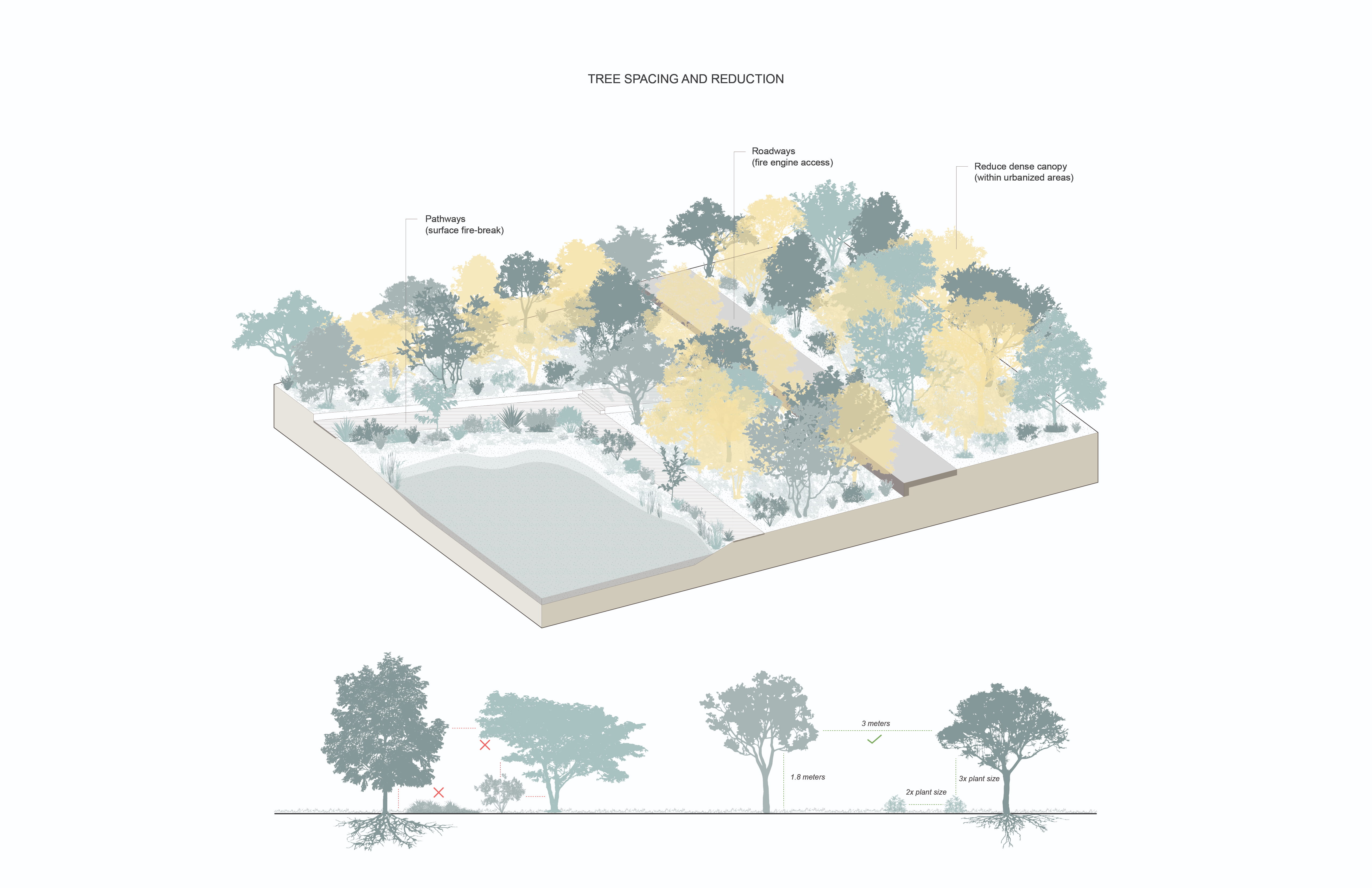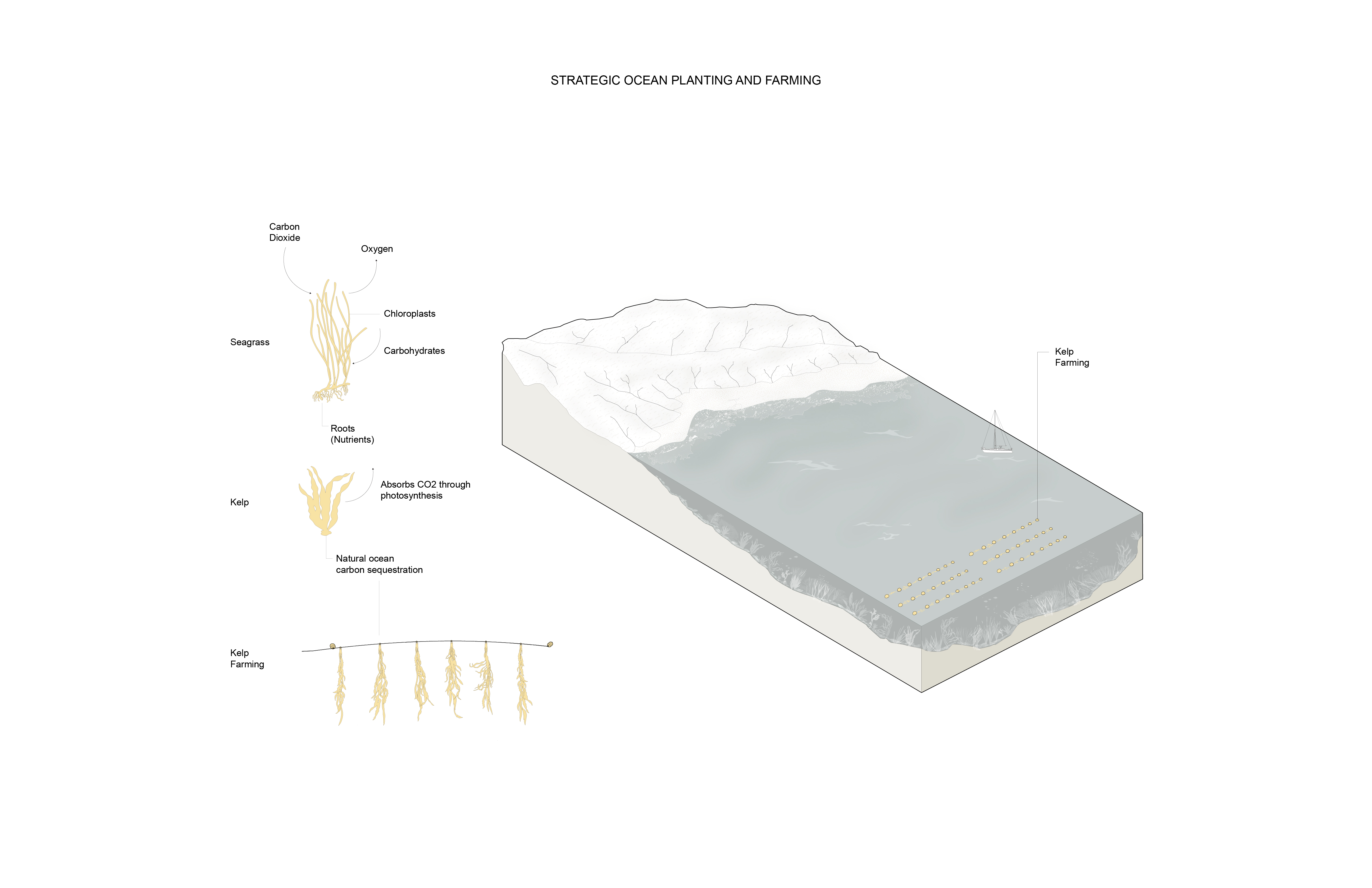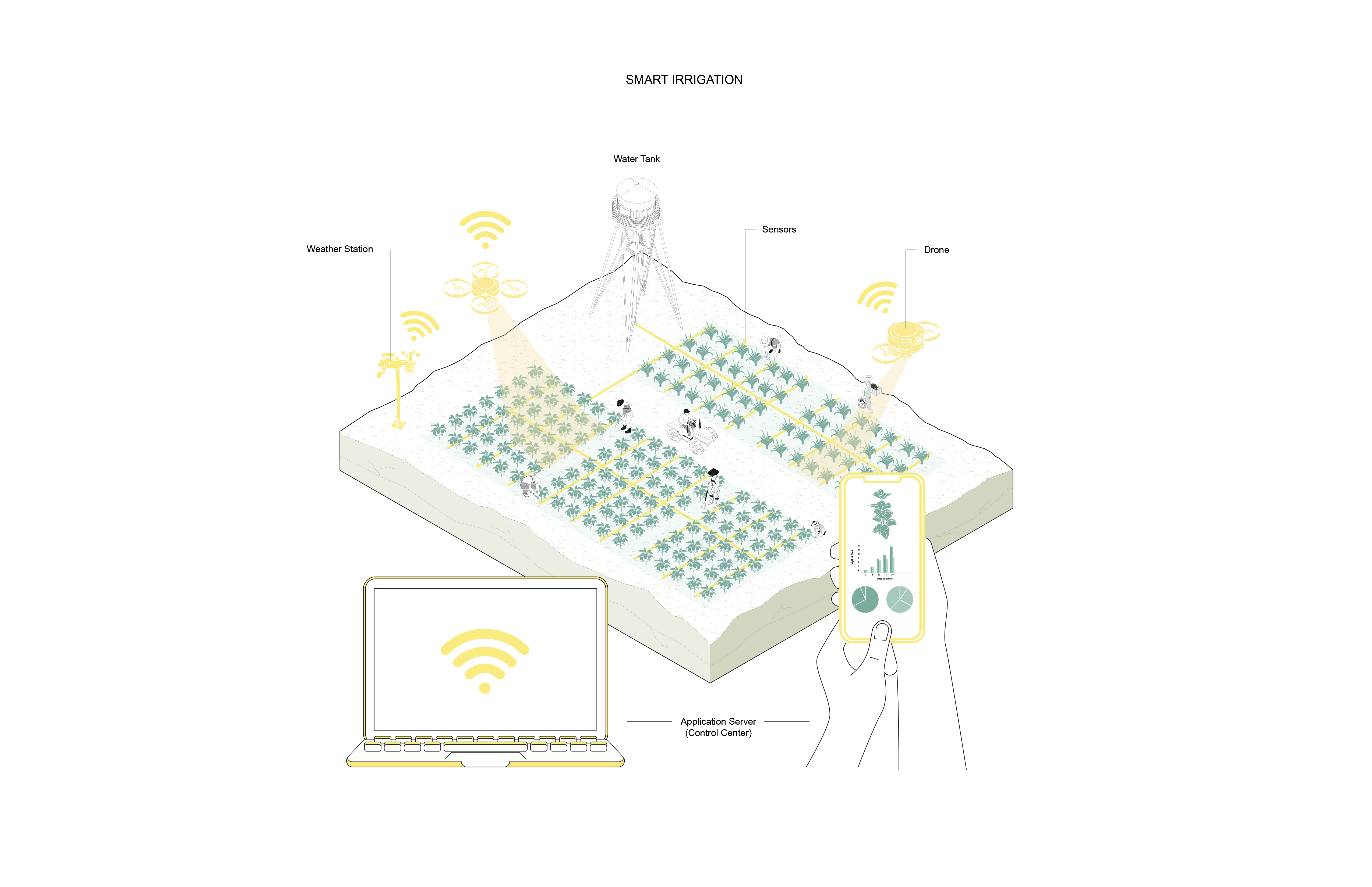 Ways to mitigate and adapt to these harsh conditions are represented by nearly one hundred climate resilience strategies visualized and indexed along the transect. The drawing spatializes natural, social, mechanical, agricultural, urban, and hydrological adaptation strategies at different scales, from site-scale to new models of urbanism and land-use planning.