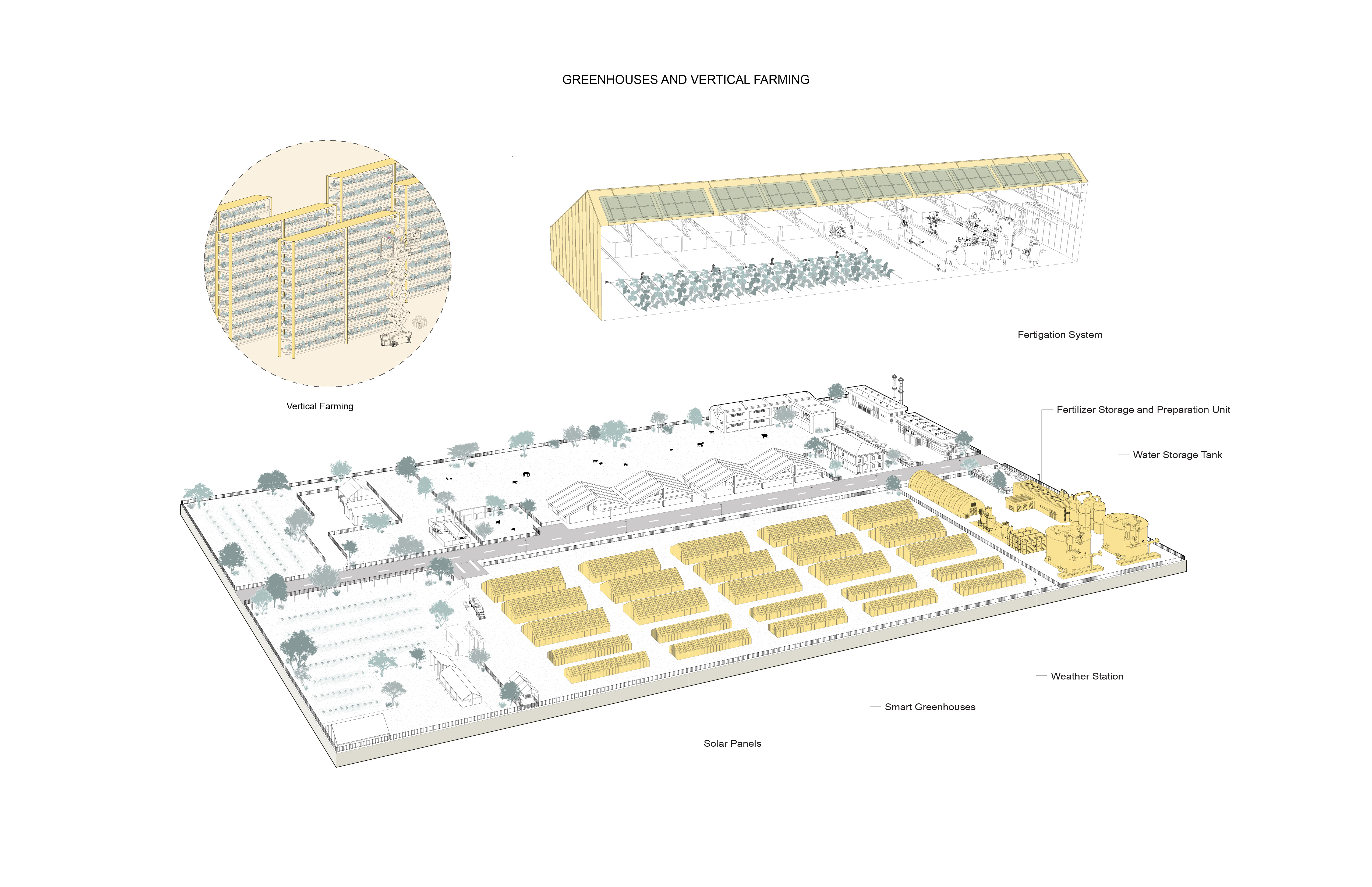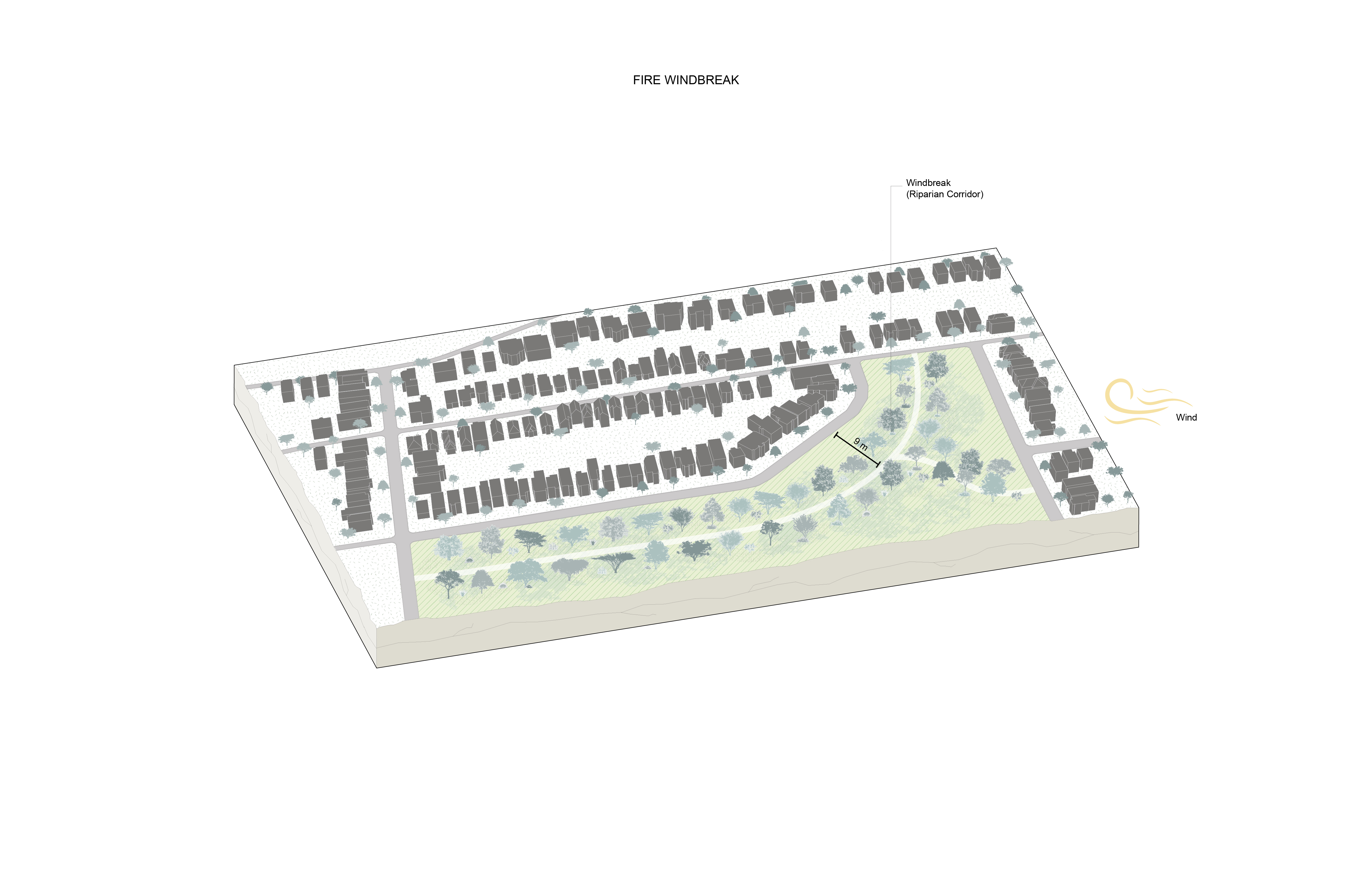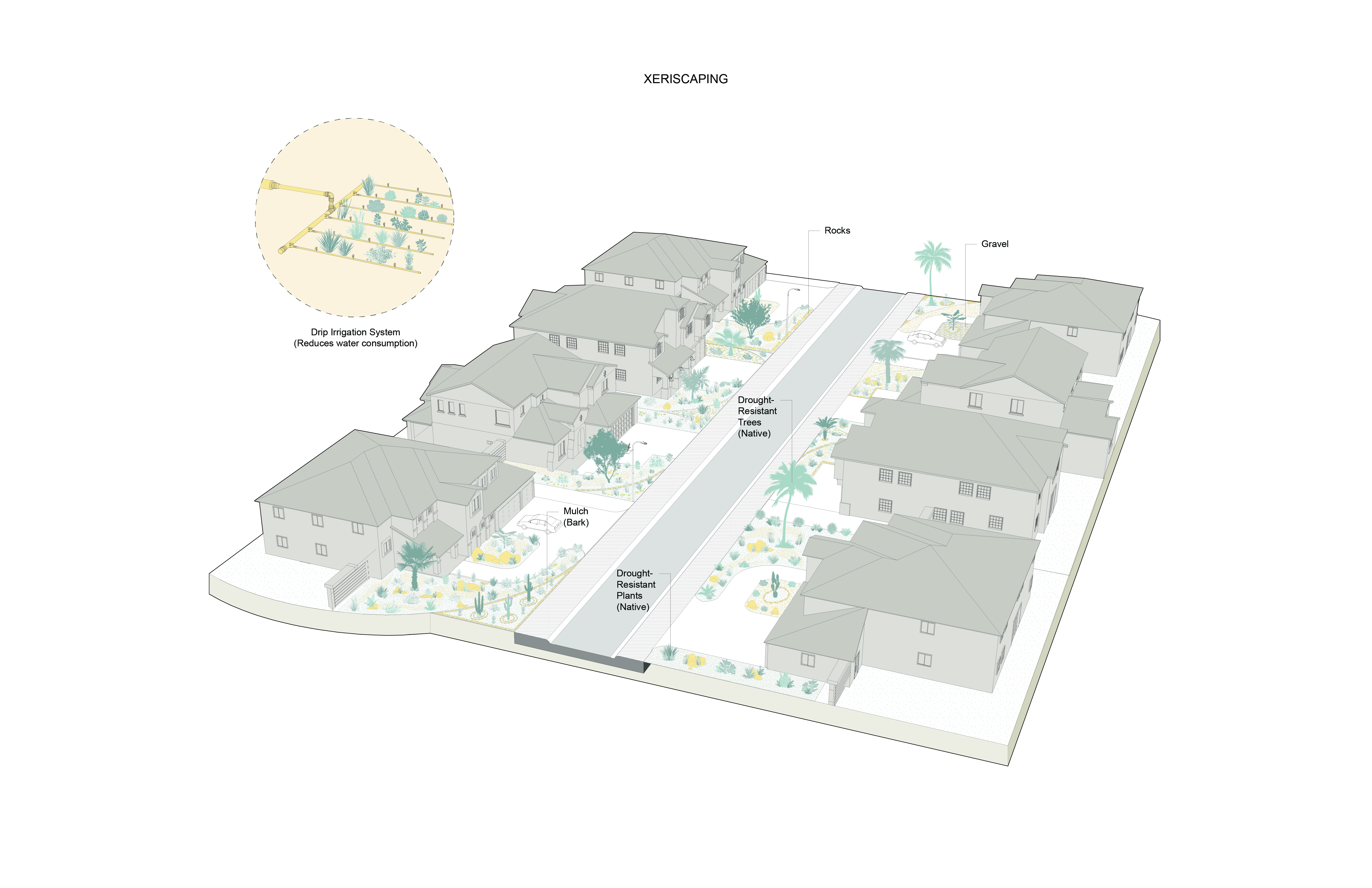 When evaporation exceeds precipitation, extreme water scarcity harms natural systems and livelihoods. Over forty percent of the world's land surface is arid or semi-arid, threatened by extremely low precipitation and climate-driven pressures that accelerate desertification. The Arid Section is a transect of a prototypical arid/semi-arid region, encompassing waterfront, urban, mid-rise, low-rise, and agricultural areas. The drawing represents climatic pressures such as extreme heat, fires, drought, and flash floods.